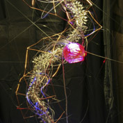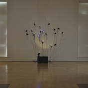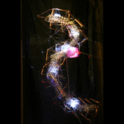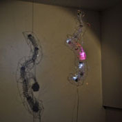 SELF is a three dimensional helix made from copper wire. Visible in the open structure are arrays of light consisting of 512 white LEDs, constructed delicately in a tubular manner. These arrays interact with the viewers around the work, triggering sequences of light movement (based on a modification of John Conway’s Game of Life) in different places depending on their location and movement. More viewers trigger more seeds, and an interesting play of lights ’battling’ for space occurs. The helix floats in open space, emphasizing its exposure and vulnerability to the world around it: it’s constant need to regenerate and fortify for what is to come.